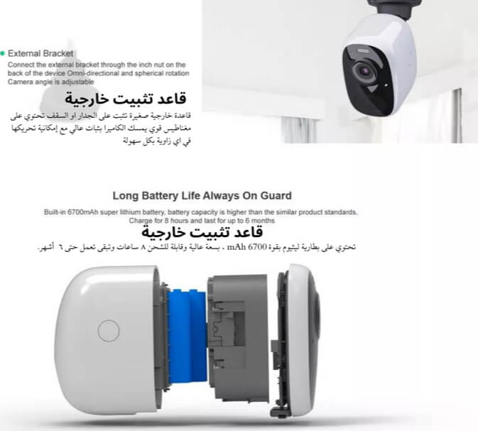 • لا حاجة إلى أسلاك أو تمديدات، مع قاعدة مغناطيسية يمكنك تثبيت الكاميرا بنفسك وبكل سهولة دون الحاجة لمساعدة او فني تركيب.