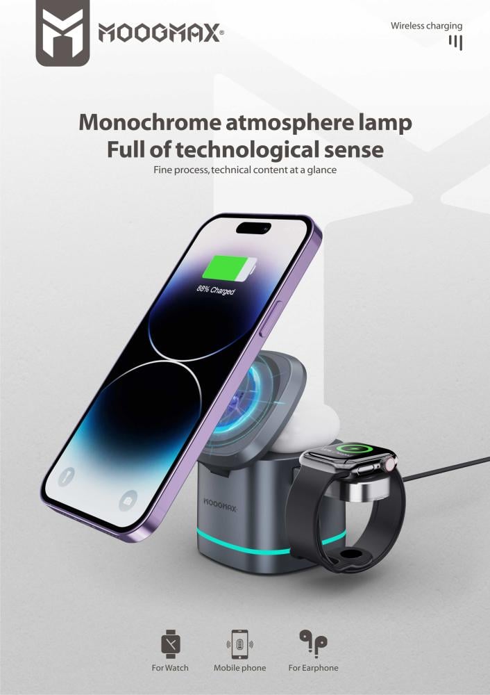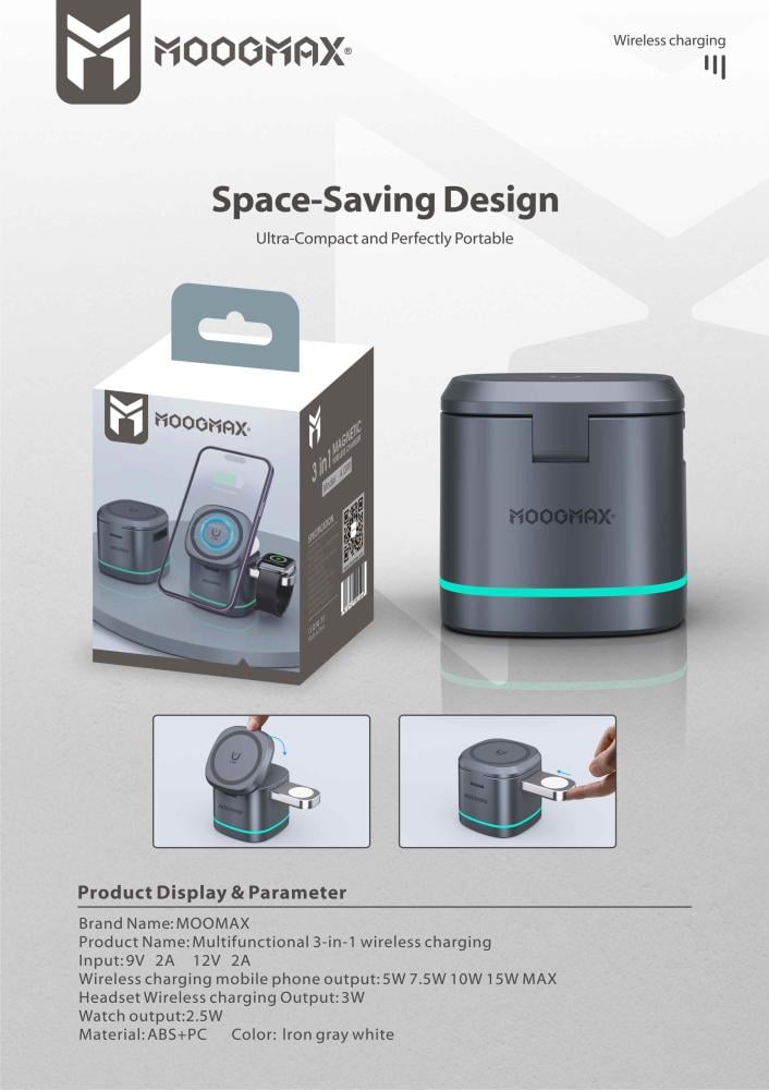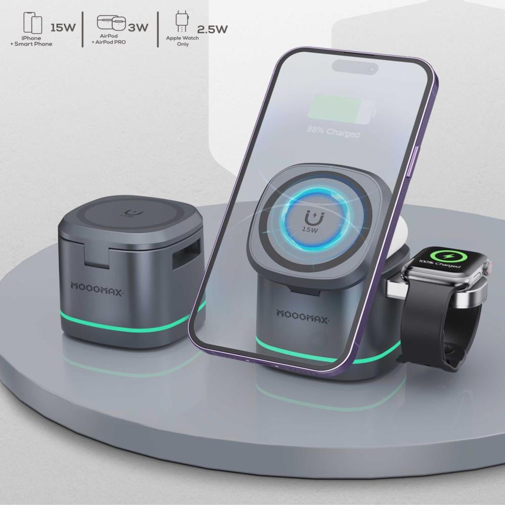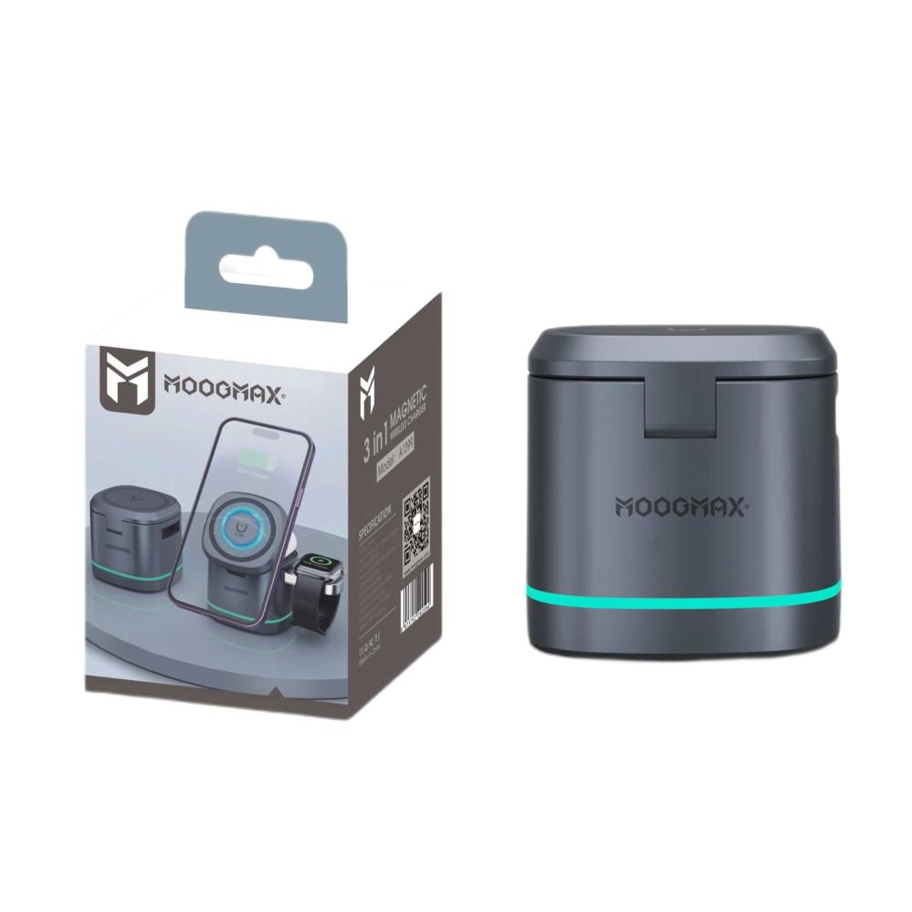 هل تبحث عن شاحن وايرلس يجمع بين الأداء العالي والتصميم العصري؟ احصل على شاحن لاسلكي 3 في 1 من MOGMAX بقوة 15 واط، وتمتع بشحن سريع وآمن لثلاثة أجهزة في وقت واحد – الجوال، السماعة، والساعة الذكية – بدون فوضى الأسلاك.